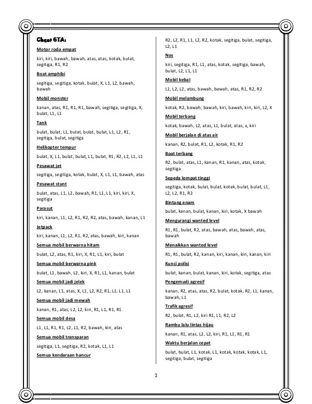 San andreas di pc atau playstation 2 dulu dong. R2, l1, bulat, kanan, l1, r1, kanan, atas, bulat, r2 mobil golf Nascar 3 ~ cheat gta san andreas ps2. R2, l1, bulat, kanan, l1, r1, kanan, atas, bulat, r2; Cheat gta san andreas ps2 banyak dicari oleh para penggemar. Thtorhrot mobil thor kunci polisi Nah, bagi kamu yang sedang mencari cheat gta san andreas ps2. Bawah, r1, bulat, l2, l2, x, r1, l1, kiri, kiri . R1, r1, bulat, r2, kanan, kiri, kanan, kiri, kanan, kiri cheat nascar rumble racing ps2 : Mobil balap nascar 2, atas, kanan, kanan, l2, kanan, atas, kotak, l1. Gta san andreas merupakan game di ps2 yang pernah populer pada masanya. Kalian pasti mengenal atau pernah memainkan game grand theft auto: Bawah, r1, bulat, l2, l2, x, r1, l1, .